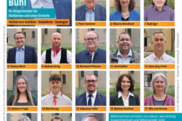 rechtzeitig zum 1. Advent möchten wir Ihnen hier unsere Stadtratsliste für die Kommunalwahl 2026 vorstellen. ✨Viele kennen die Namen bereits – heute möchten wir sie aber auch sichtbar machen.Danke an alle, die sich mit Zeit, Herz und Energie für Heilsbronn einsetzen. 😊 Unsere Kandidatinnen und Kandidaten:1 Sebastian Buhl2 Andrea Eger3 Wolfgang Prager4 Marie-Therese Berisha (geb. Annon)5 Peter Stemmer6 Viktoria Wendland7 Rudi Eger8 Thomas Merk9 Andreas Krieg10 Bernhard Pfützner11 Gerd Baßler12 Hans-Jörg Christ13 Johanna Prager14 Ben Herzog (geb. Deeg) 15 Sebastian Feiler…